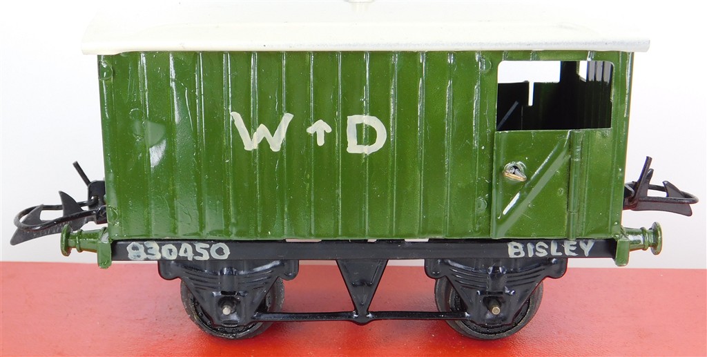 A reasonably well repainted Hornby O gauge WD (War Department) brake van, type 3 chassis, hand lettered, no original box