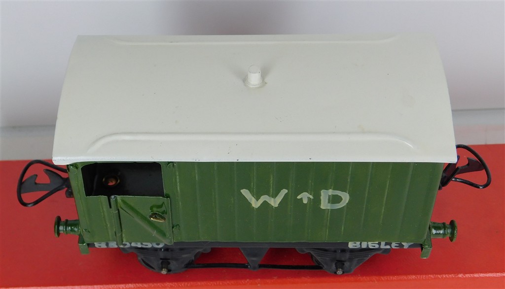 British 0 Gauge : Repainted Hornby O gauge WD (War Department) brake van, type 3 chassis