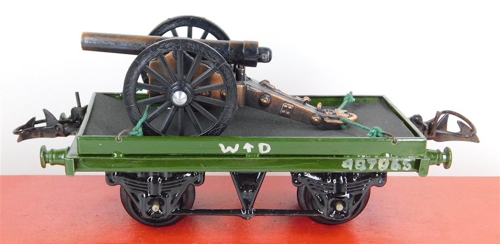 A reasonably well repainted Hornby O gauge WD (War Department) one plank wagon with cannon load, type 3 chassis, hand lettered, various numbers, no original box