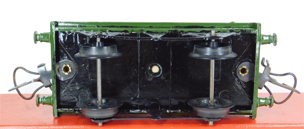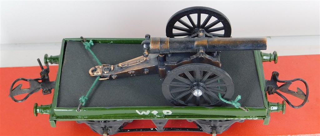 British 0 Gauge : Repainted Hornby O gauge WD (War Department) one plank wagon with cannon load, type 3 chassis