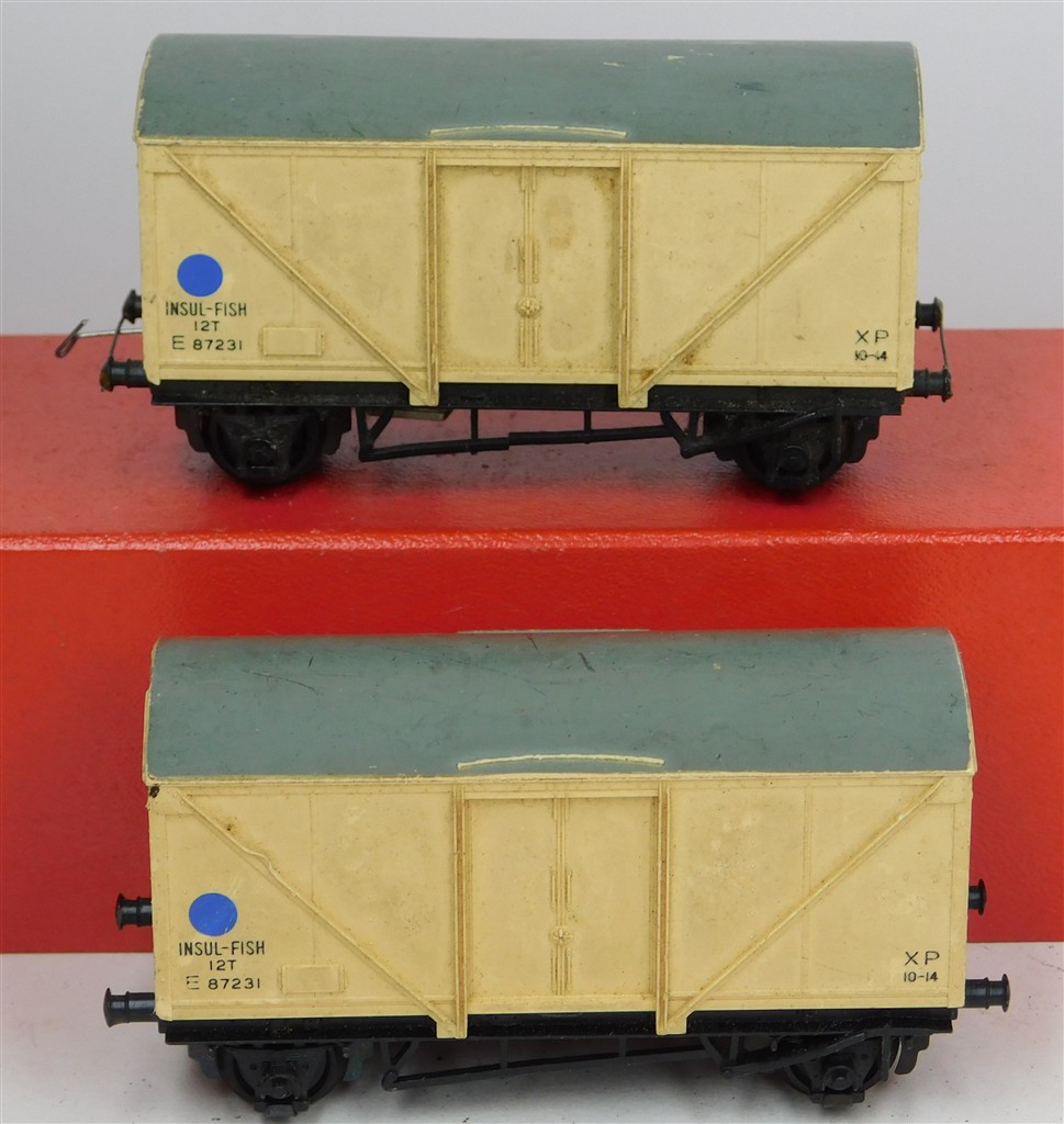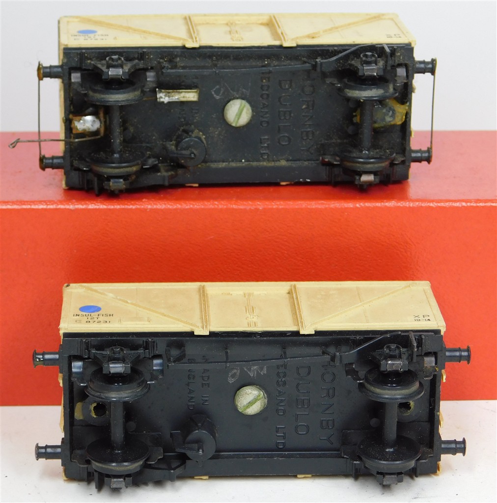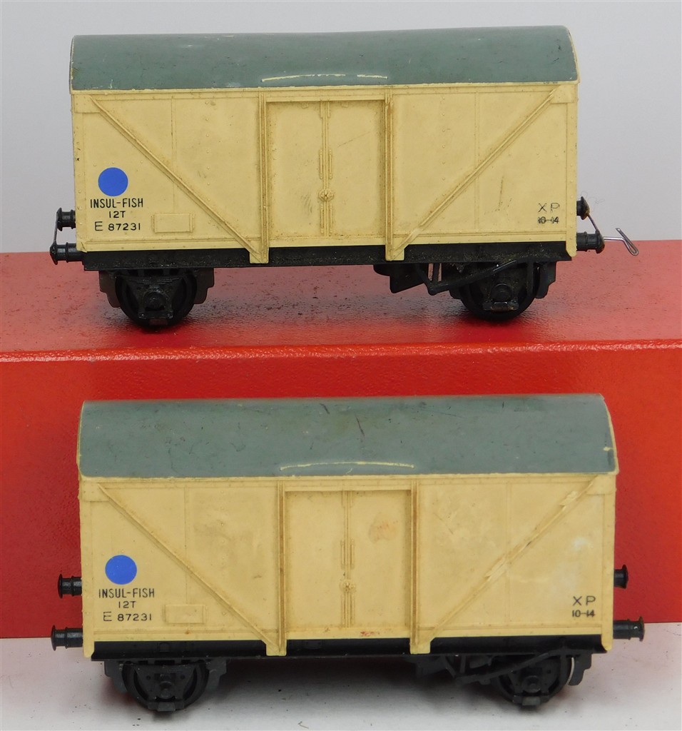 Hornby Dublo: 2 Hornby Dublo 2 or 3 rail blue spot fish van, couplings removed