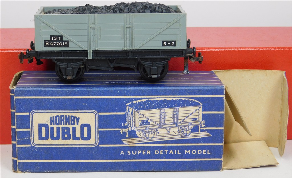 A Hornby Dublo 32076 2 or 3 rail 5 plank open wagon with coal load number B477015, in good condition, supplied in the original box