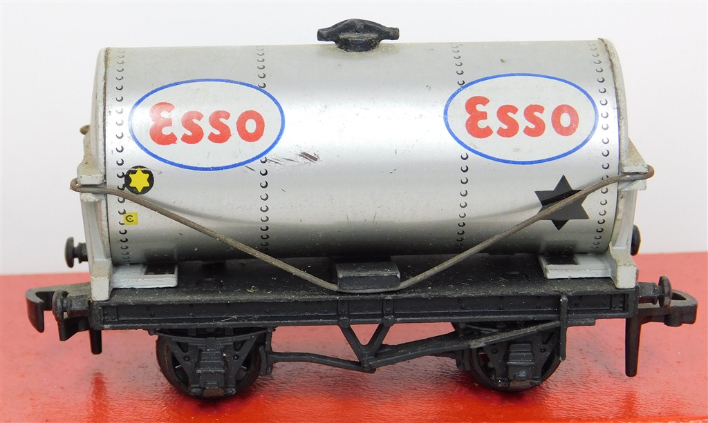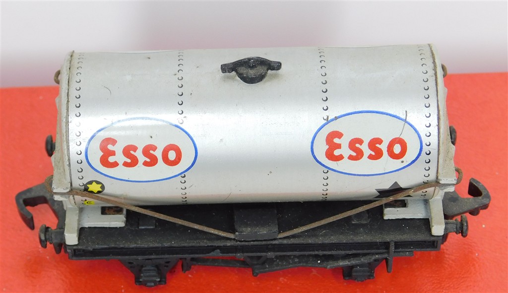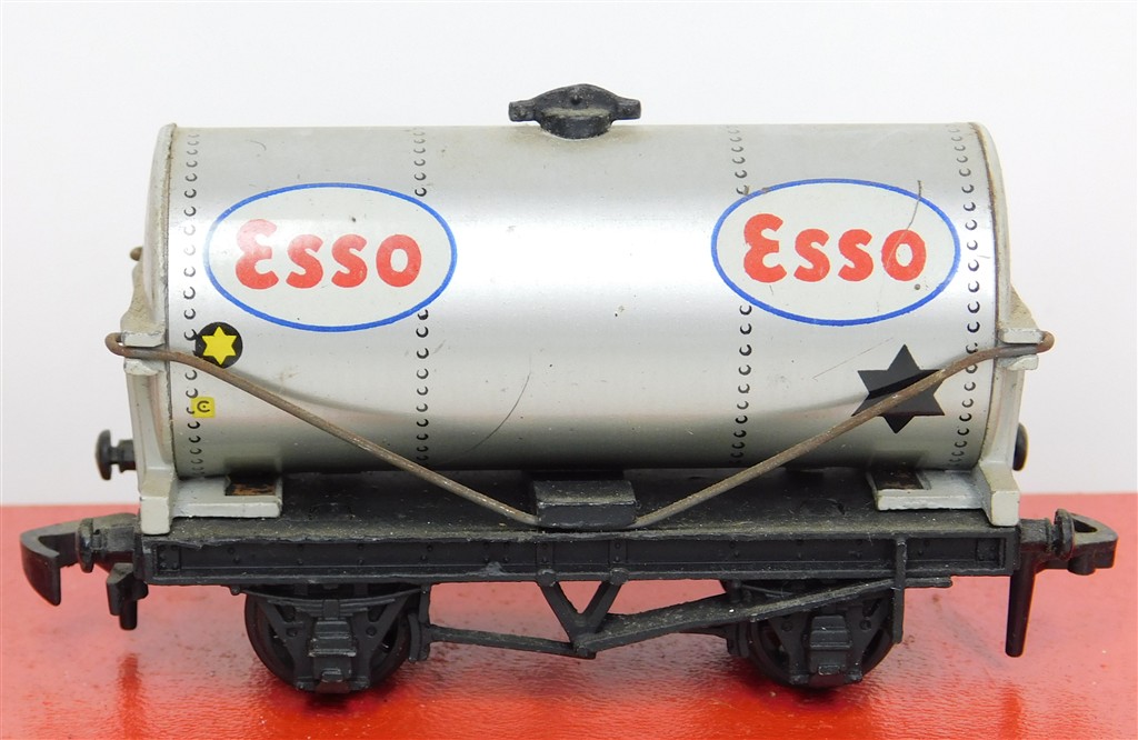A Hornby Dublo 2 or 3 rail Esso tank wagon, open brake gear chassis, plastic couplings, in fair condition, no original box
