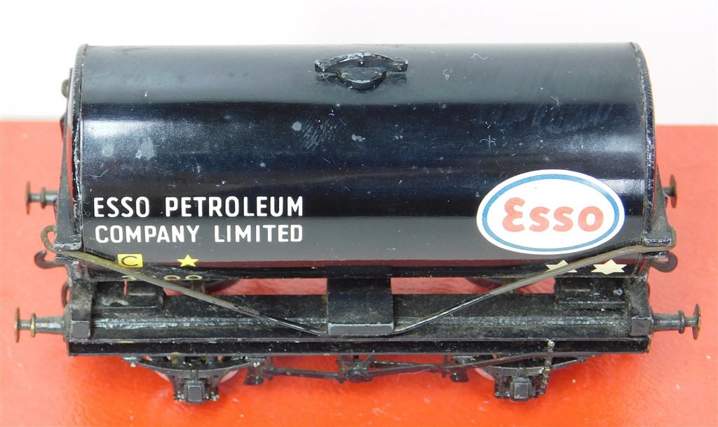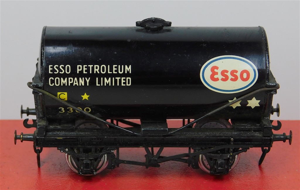 A Hornby Dublo 2 or 3 rail black Esso tank wagon, replacement chassis fitted, 3 link couplings, in fair condition, no original box