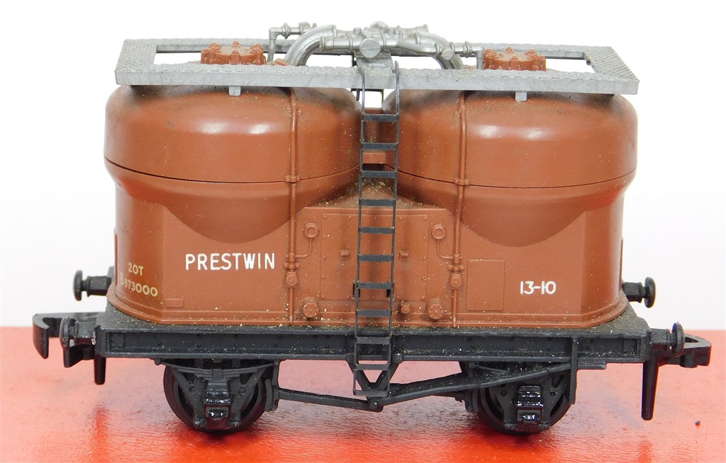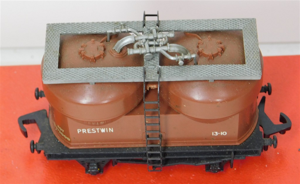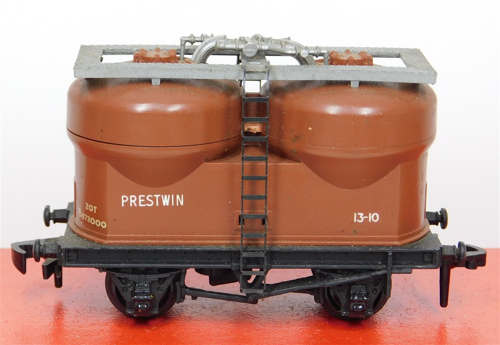 A Hornby Dublo 2 or 3 rail Prestwin twin silo wagon number B873000, open brake gear chassis, plastic couplings, in good condition, no original box