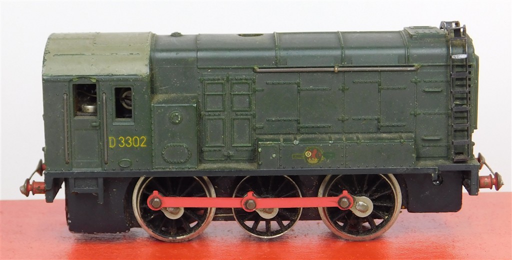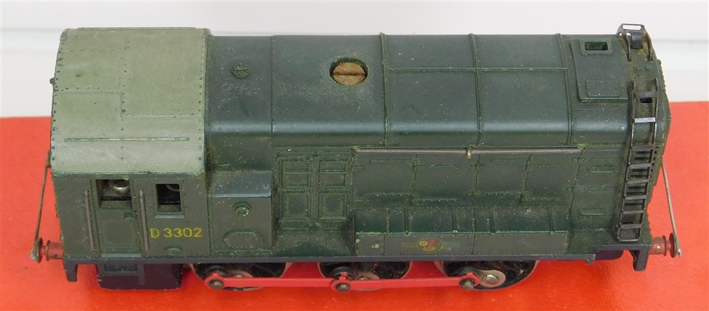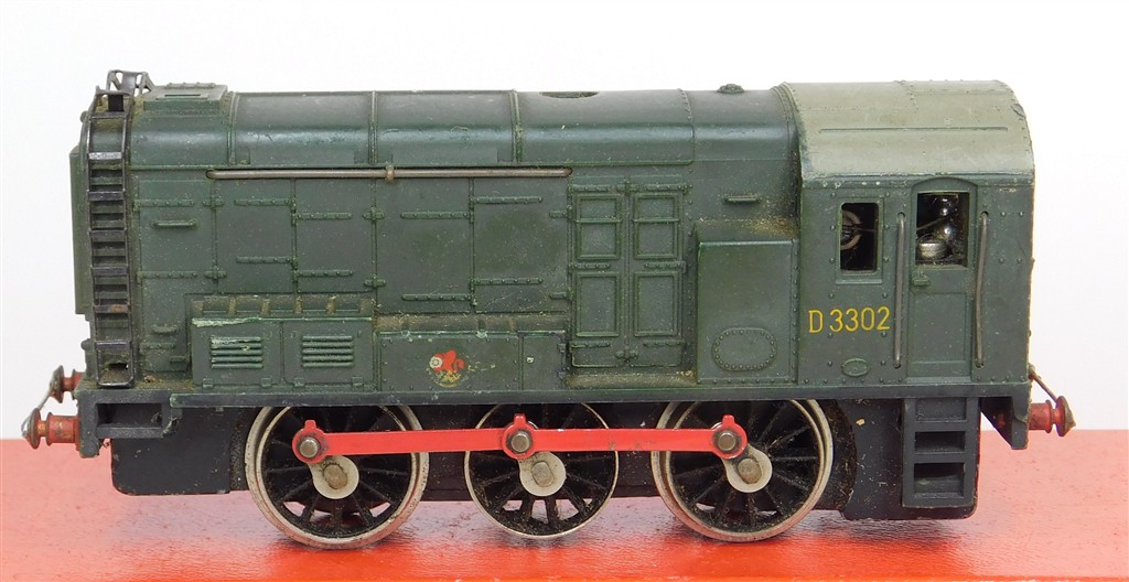 A Hornby Dublo 2 rail diesel shunter, very reluctant runner, needs a thorough electrical clean and lubrication, draws over 1amp so may need remagetising, missing side frames, no couplings, bar glued across buffer beams, in poor condition, no original box, sold as a project or a source of parts