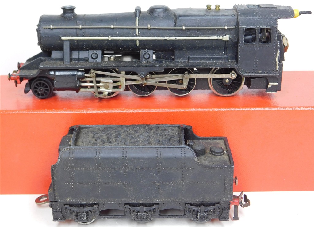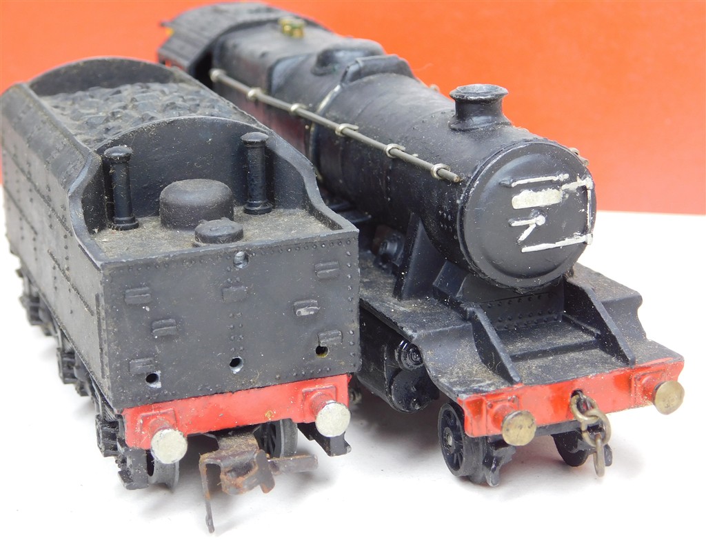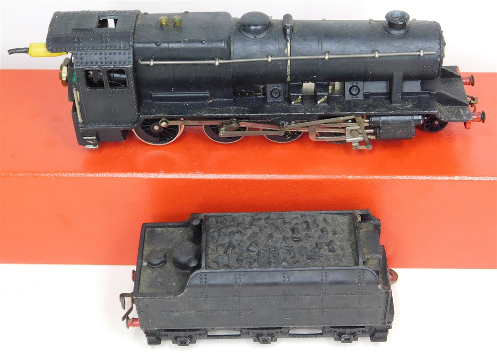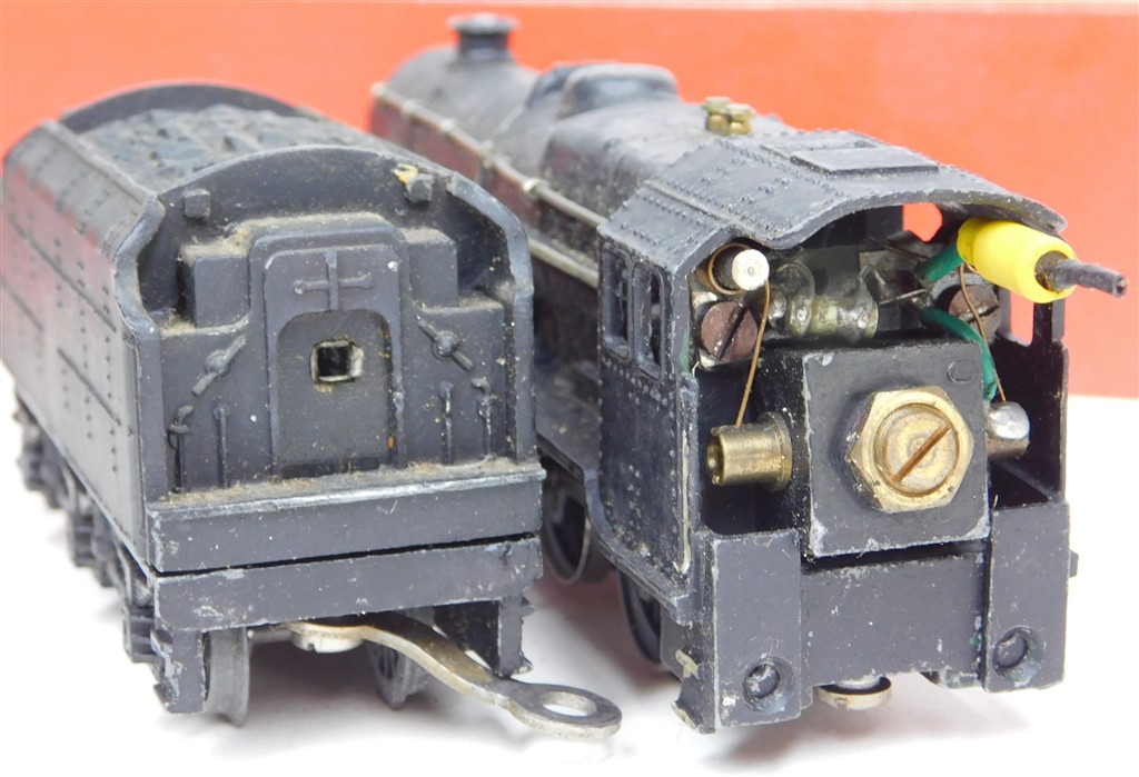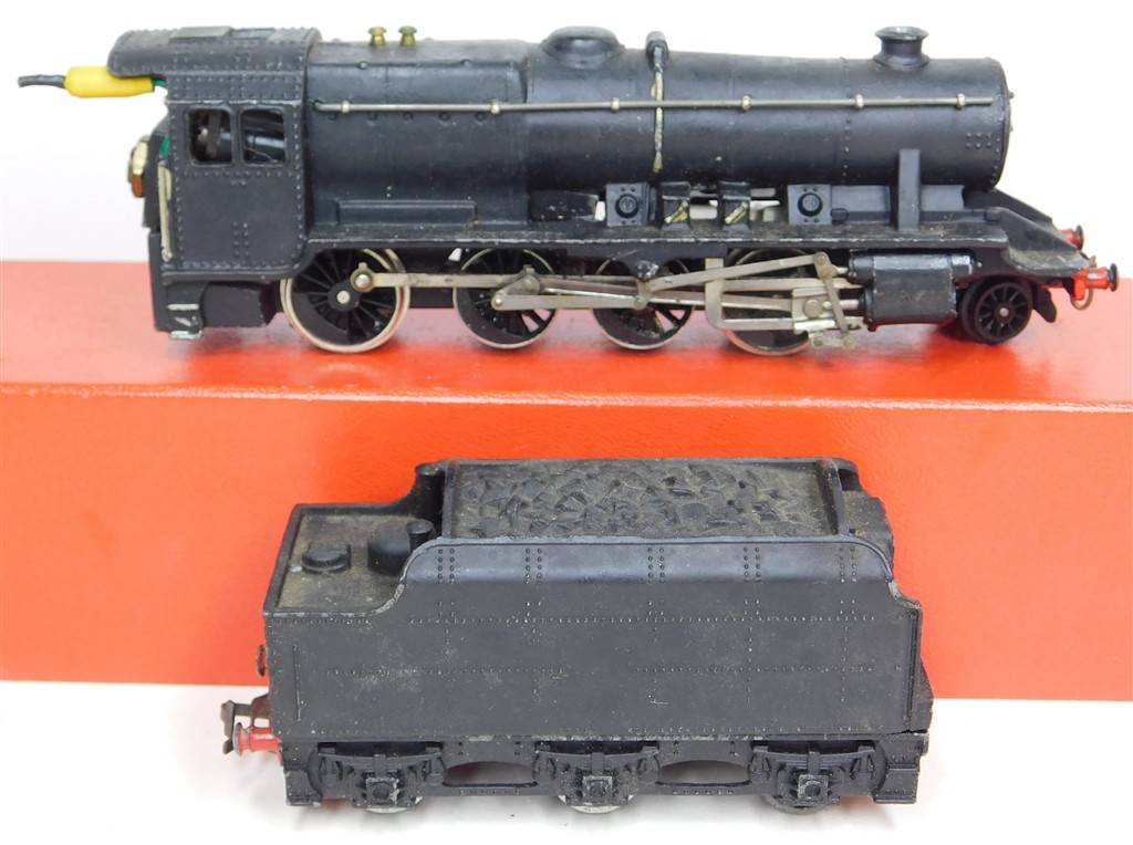 An incomplete Hornby Dublo 3 rail 8F, repainted, motor runs, needs a thorough electrical clean and lubrication, missing all pickups and wiring, in fair condition, no original box, sold as a project needing work otr a source of parts