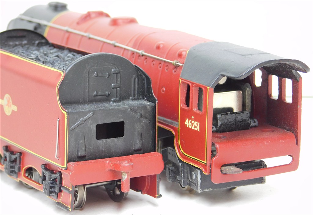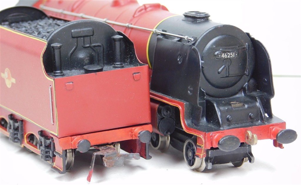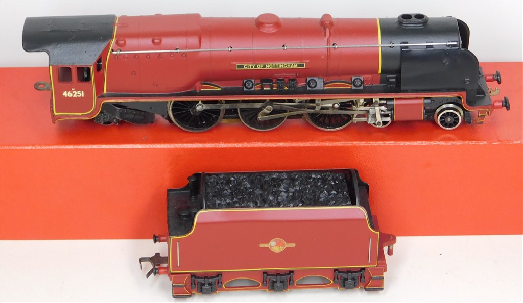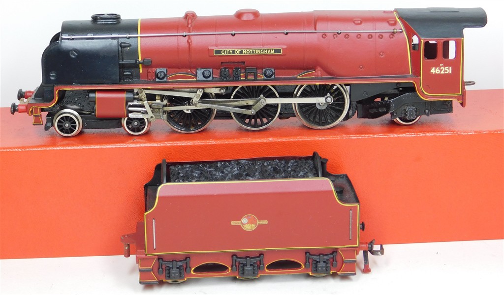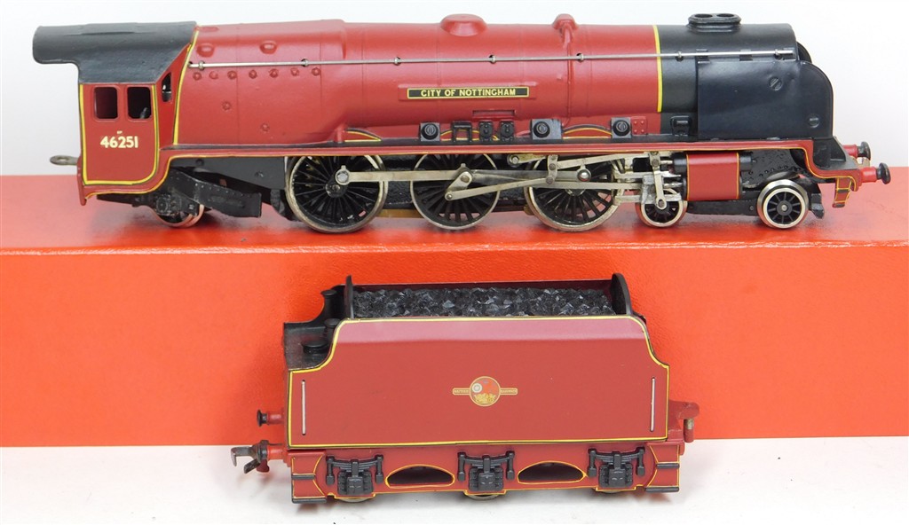 A nicely repainted Hornby Dublo 2 rail City of Nottingham, noisy reluctant runner, needs a thorough electrical clean and lubrication, fitted with a neo-magnet, might be better with an ordinary magnet, in good condition, no original box, sold as a project needing work
