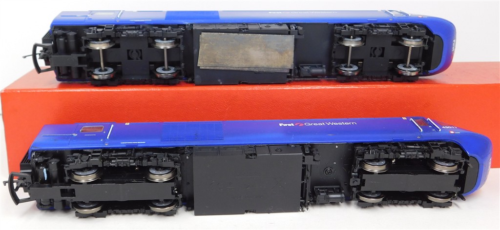 A Hornby new design First Great Western HST power car pair, noisy runner: has been fitted with new power bogies but whilst it runs ok there are strange noises so I suspect something isn't quite right, in good condition but needs a clean, working headlights, no original box, sold as a project, supplied with the original bogie parts.