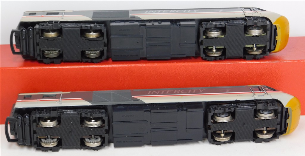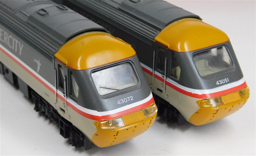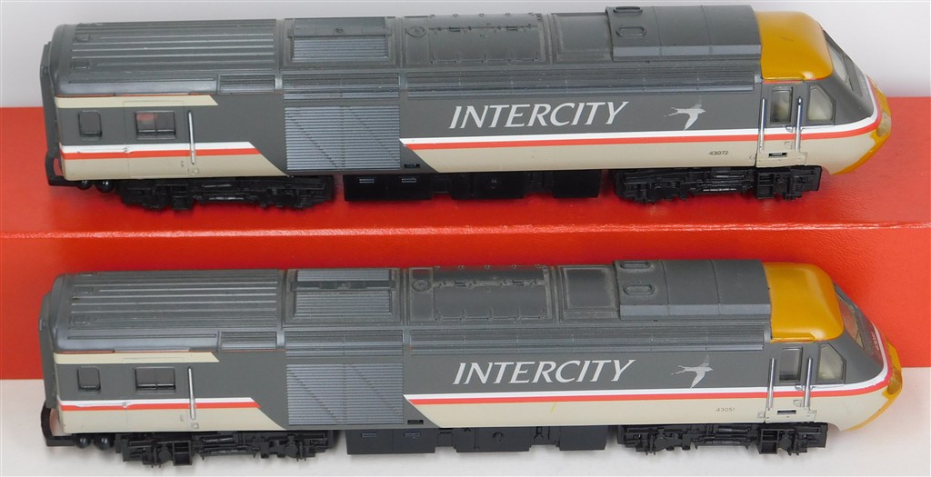 A Hornby ringfield motor InterCity 125 pair including power and trailer car ends, tested and in working order and good condition, no original box, non-directional headlight in power car, directional headlight in non-powered power car, please note a centre coach will be required to run this set.