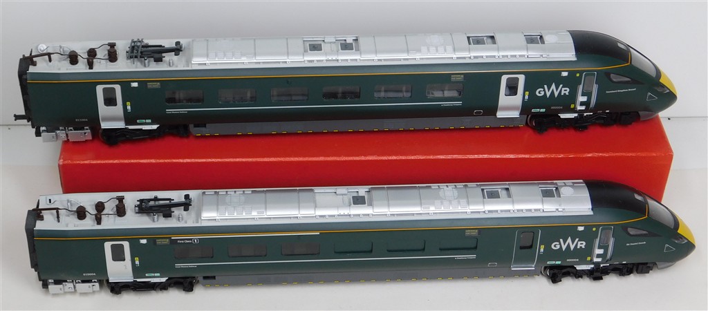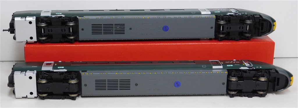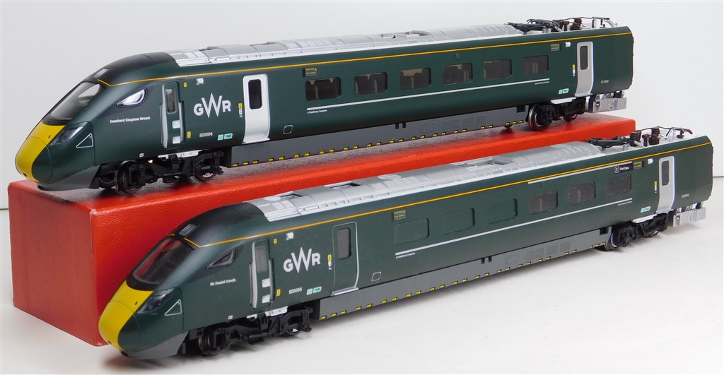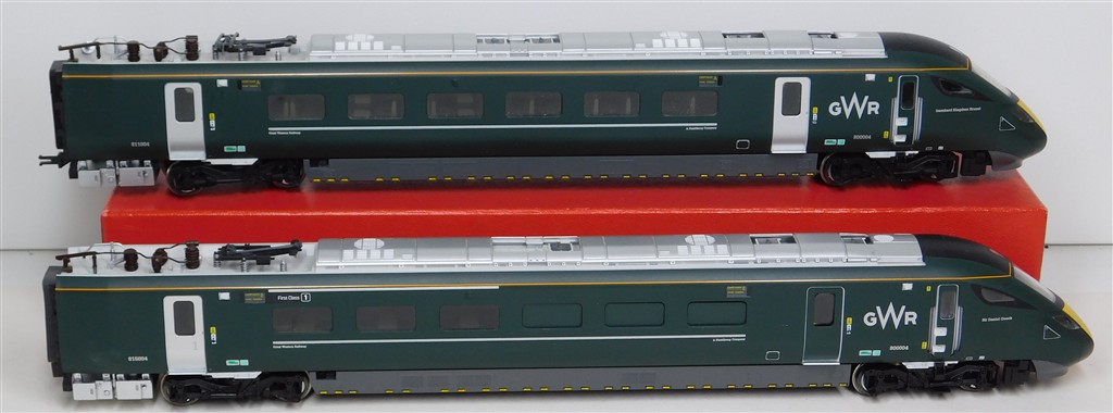 A Hornby GW Class 800 power and trailer car ends, tested and in working order, directional headlights in powered car, interior lights in non-powered car, missing some parts of one pantograph and some isolators otherwise in good condition, no original box.