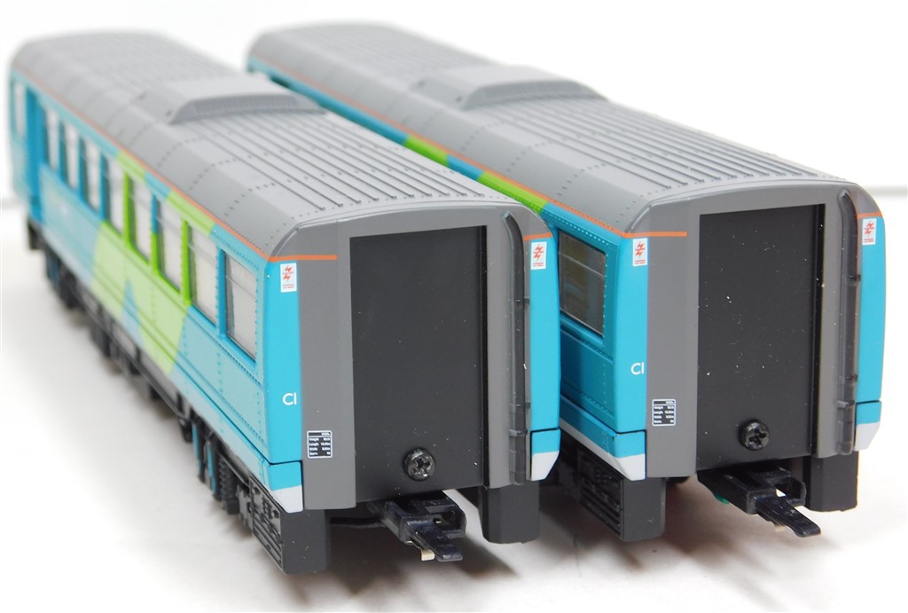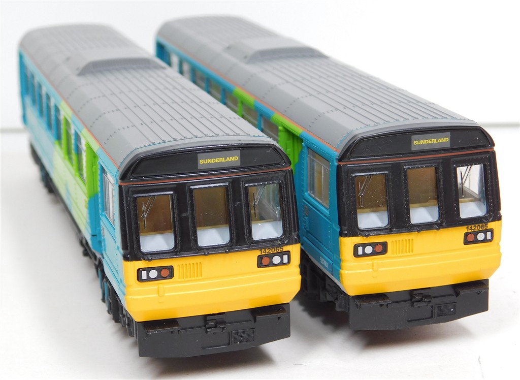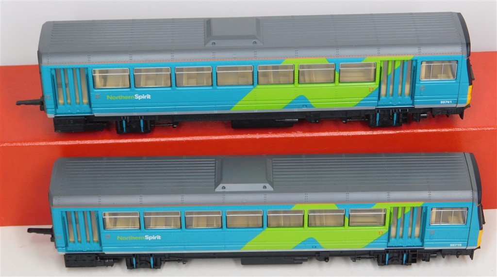 A Hornby Northern Spirit class 142 Pacer railcar set number 142 065, good runner: single power car version so needs careful acceleration and both cars to be connected together to run well, in good condition, supplied in the original box polystyrene tray only
