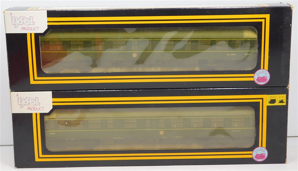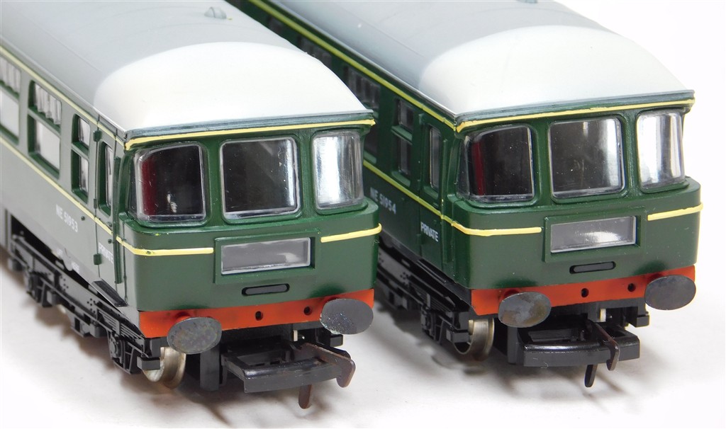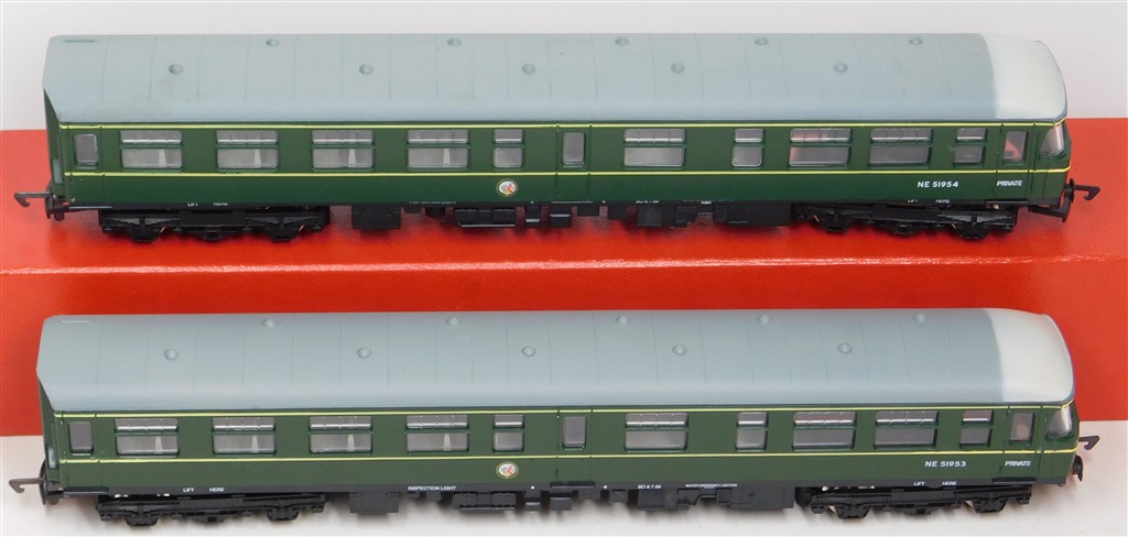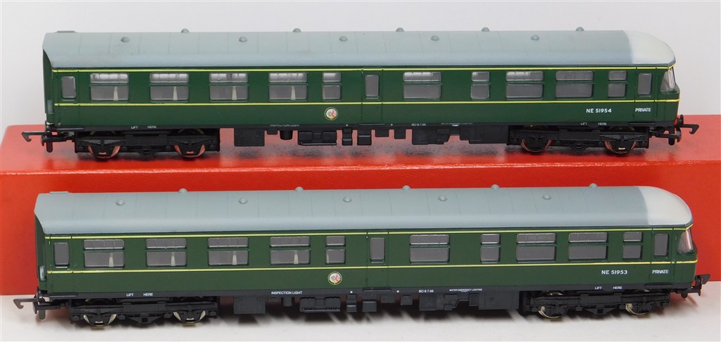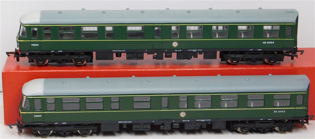 A Dapol D95B 2 car Trans-Pennine DMU number NE51594+NE51593, good runner, in good condition, supplied in the original box. Please note this is the old Trix tooling so the unit is 3.8mm/ft scale and Dapol designed the chassis to raise the body up a little.