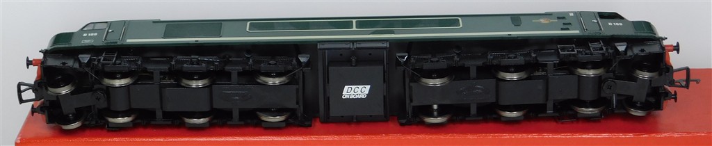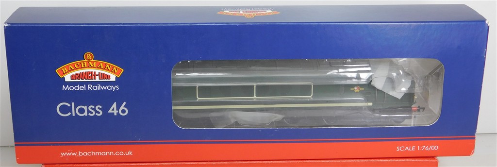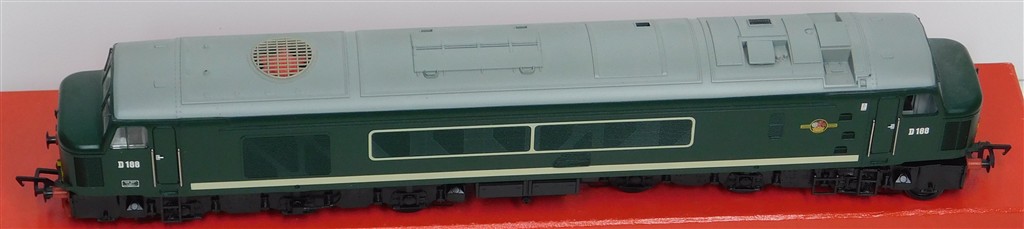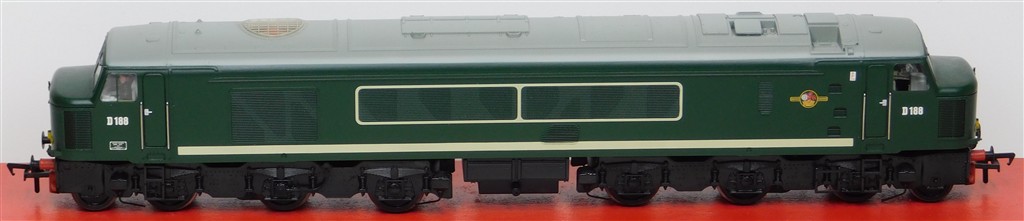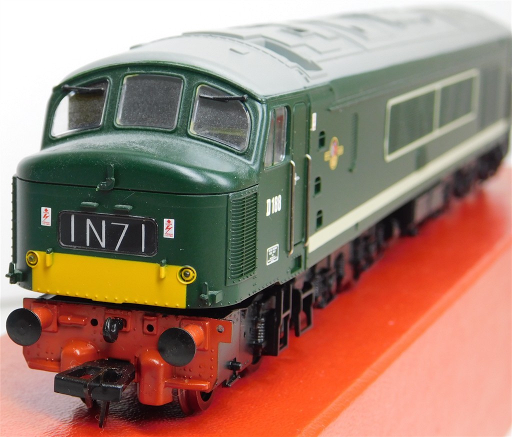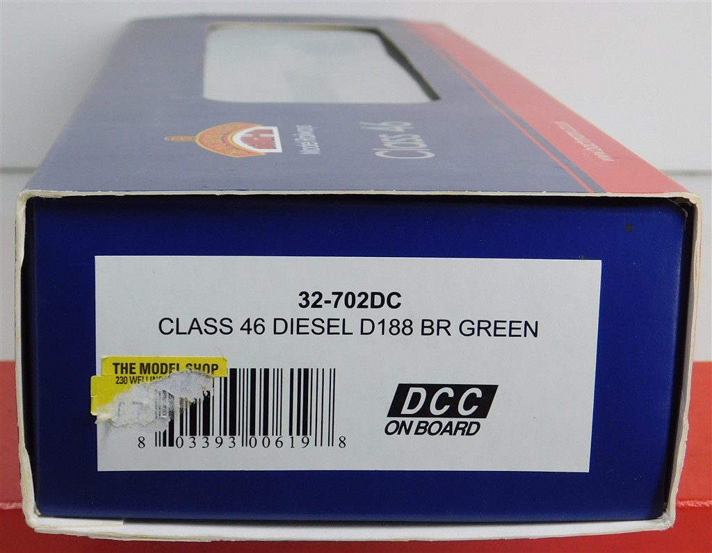 A Bachmann 32-702 BR green class 46 Peak diesel loco number D188, good runner with directional head and tail lights, in very good condition but one cab window has been pushed in and needs refitting, supplied in the original box with unopened detail pack, with instructions. Note that the model states DCC fitted but the DCC chip has been removed and a blanking plate fitted for DC (analogue) use.
