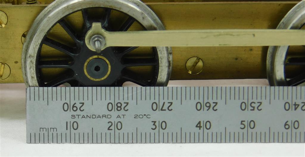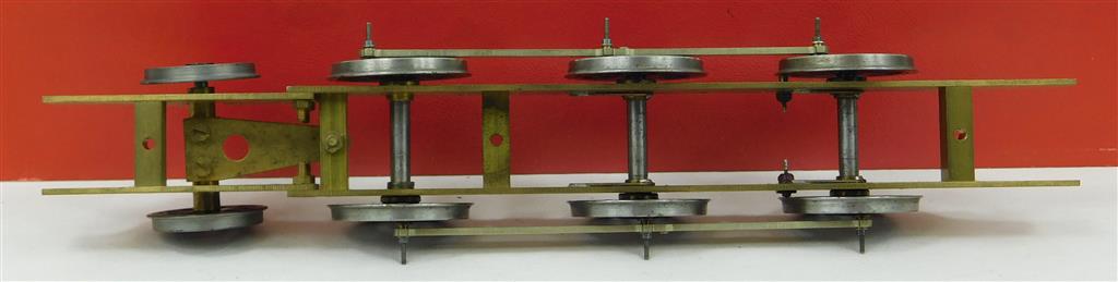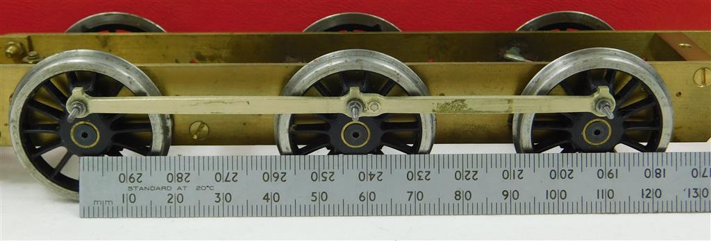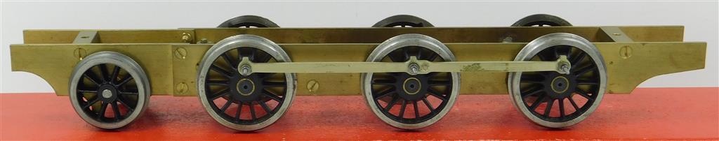 0 scale brass 0-6-2 rolling chassis with Slater's wheels, type unknown, driving wheelbase 51mm+56mm+47mm, 32mm diameter driving Slater's wheels with complete crankpins and con-rods, 25mm diameter pony wheels, 238mm long