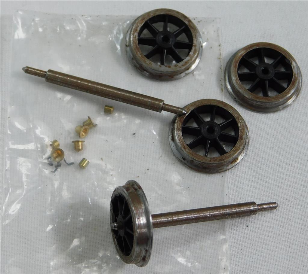 A Slater's 0 scale 2'6" 8 spoke wagon wheels, pair, axles shortened and turned to pin-points, with some top hat bearings, some surface rust, no original packet