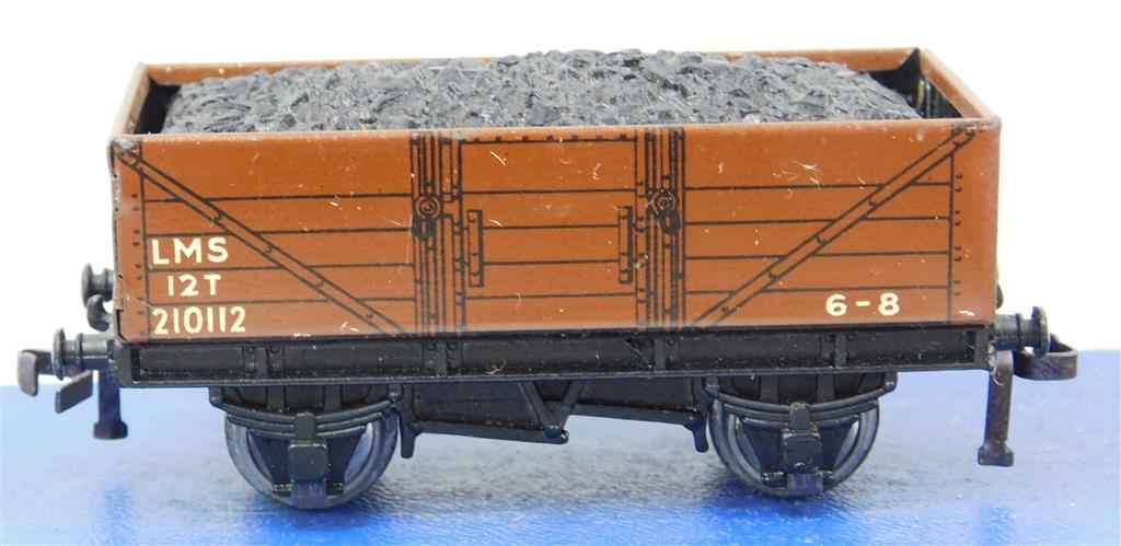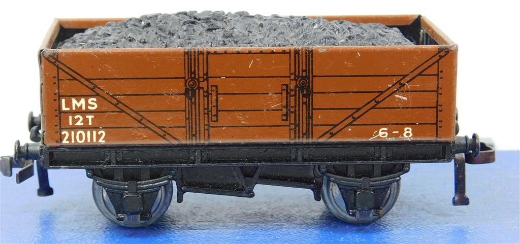 A Hornby Dublo 3 rail tinplate LMS open wagon numbered 210112 with load, uninsulated metal wheels fitted, in good used condition, supplied in the original box