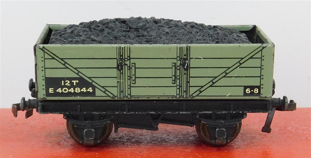 A Hornby Dublo 3 rail tinplate BR open wagon numbered M404844 with load, uninsulated metal wheels fitted, in good used condition, no original box