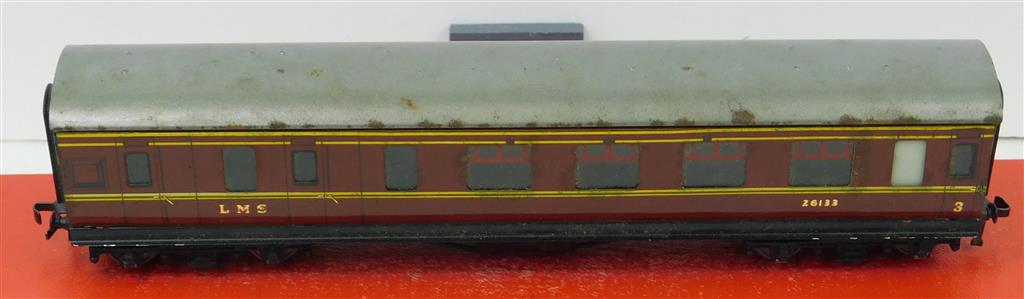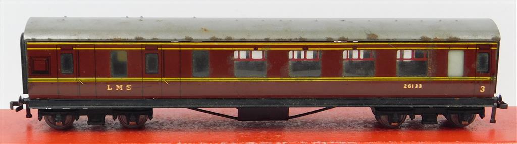 A Hornby Dublo 3 rail tinplate LMS Stanier brake coach numbered 26133, uninsulated metal wheels fitted, in good used condition, needs a clean, supplied in the original box