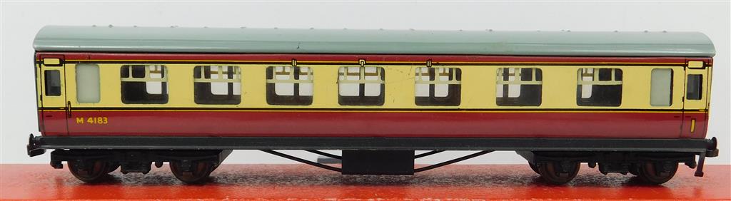 A Hornby Dublo 3 rail tinplate BR Stanier composite coach numbered M4183, uninsulated metal wheels fitted, in good used condition, needs a clean, supplied in the original box