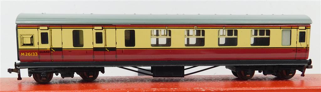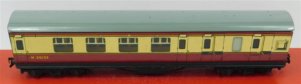 A Hornby Dublo 3 rail tinplate BR Stanier brake coach numbered M26133, uninsulated metal wheels fitted, in good used condition, needs a clean, no original box