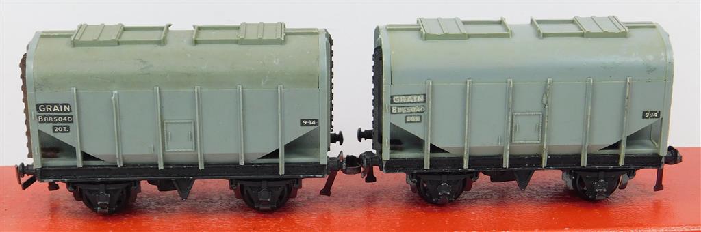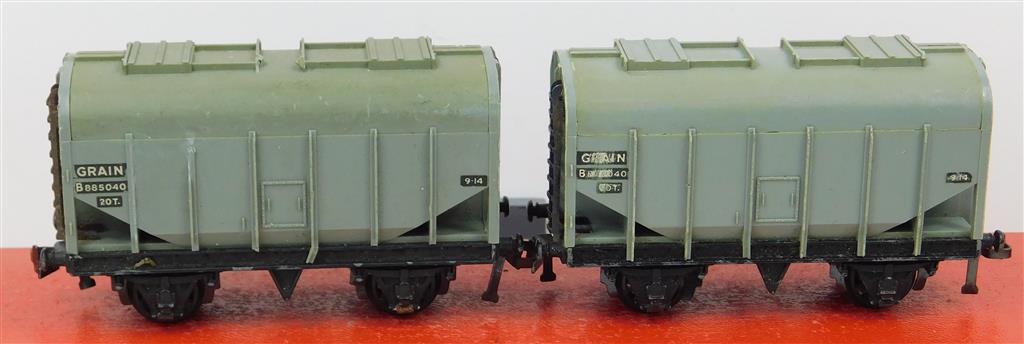 2 Hornby Dublo 2 or 3 rail plastic bodied grain wagons, plastic wheels fitted, in fair condition, supplied in the original boxes