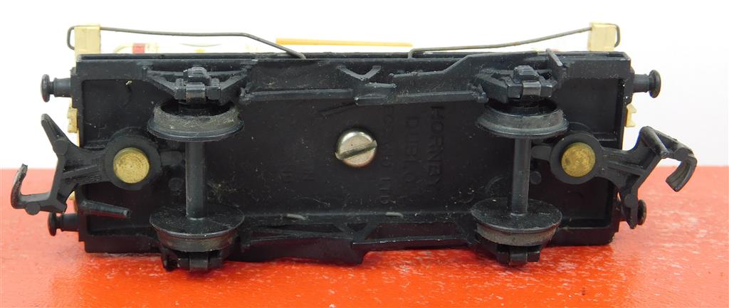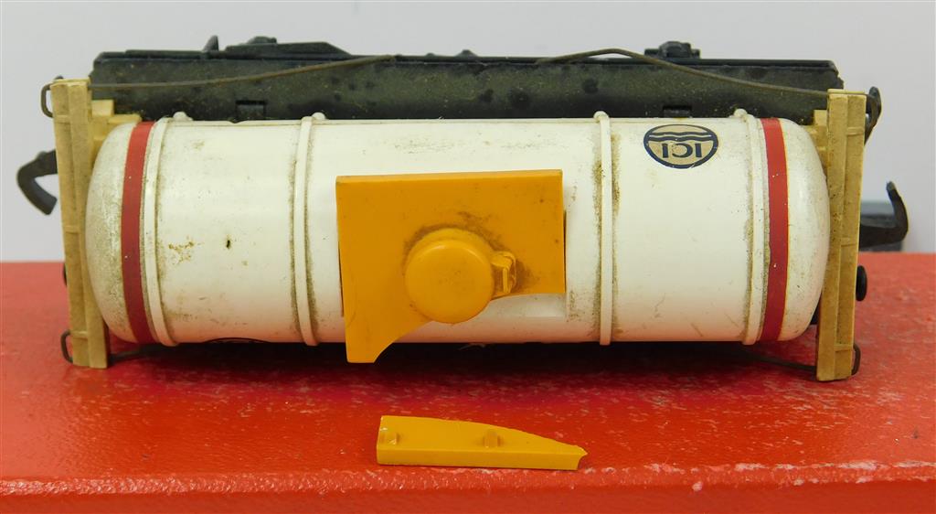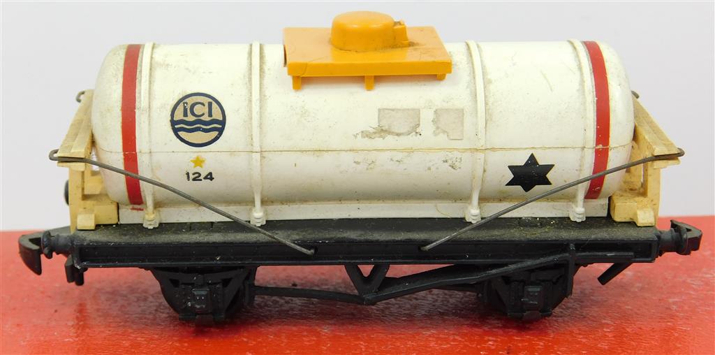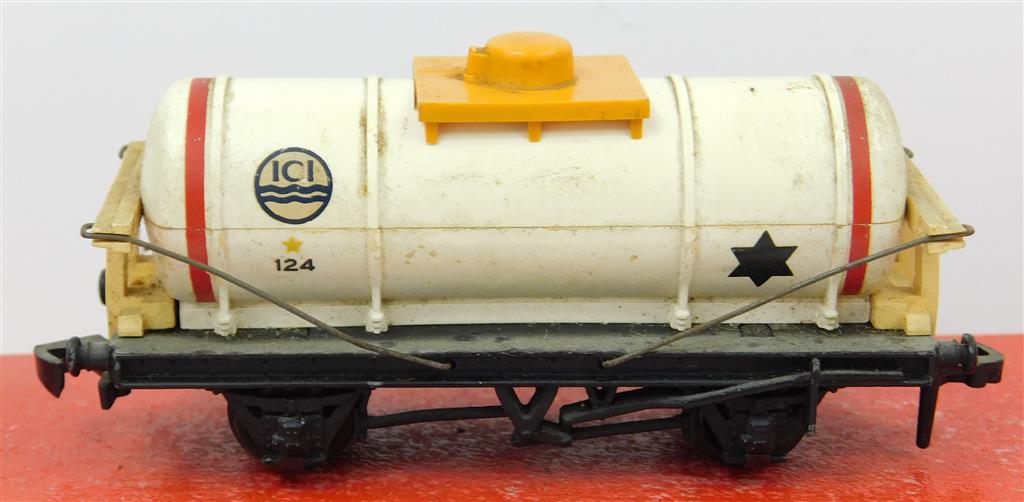 A Hornby Dublo 2 or 3 rail plastic bodied ICI tank wagon, plastic wheels fitted, needs a thorough clean and repair to the filler cap plate otherwise in good condition, no original box