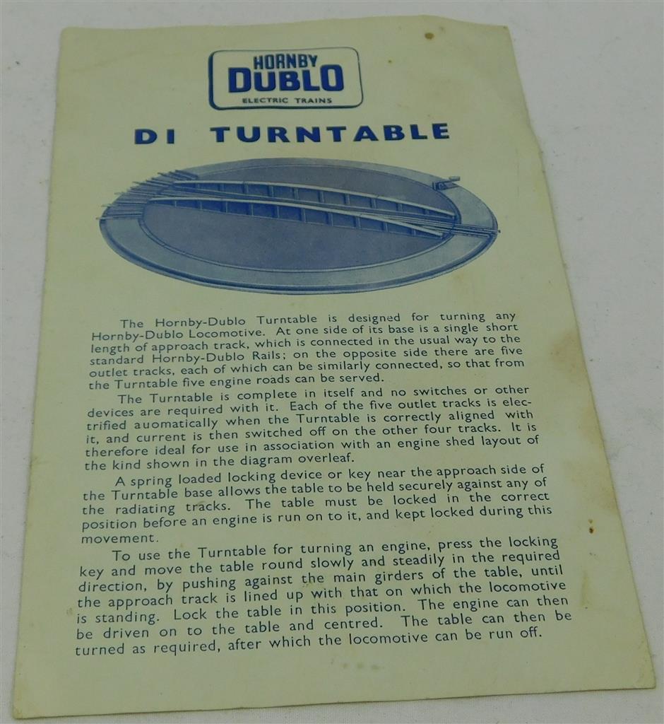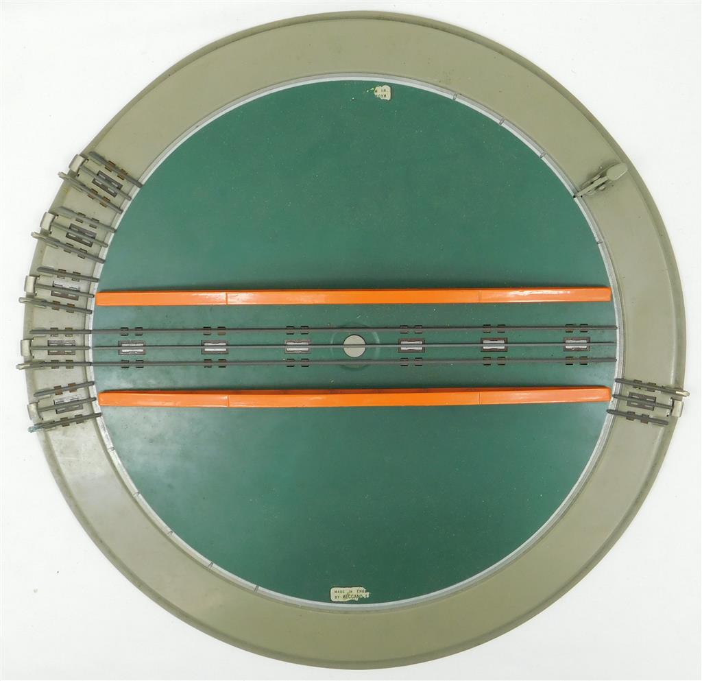 A Hornby Dublo 3 rail tinplate turntable, stiff and would benefit from a little adjustment to be flat and turn easily otherwise in good used condition, needs a clean, tatty original box with instructions