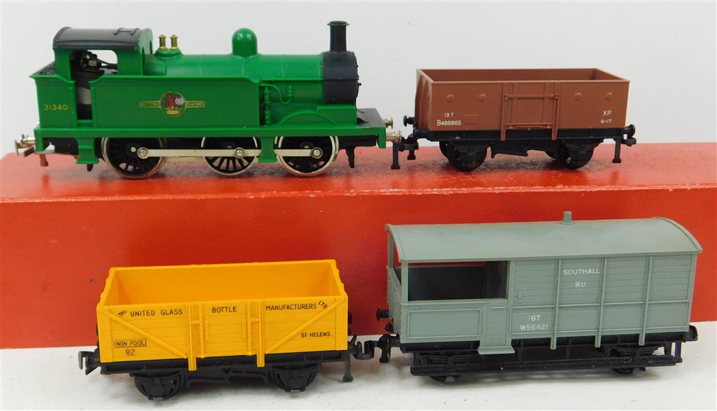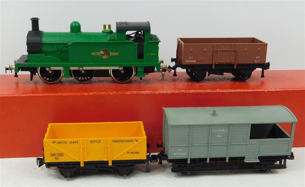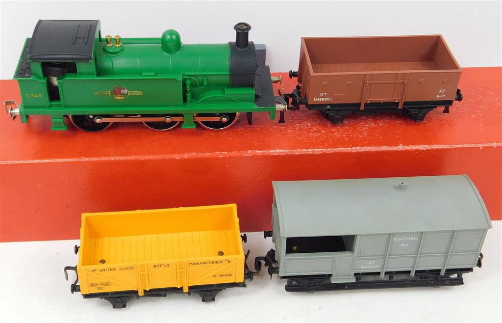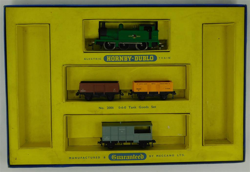 A Hornby Dublo 2006 2 rail set with green R1 0-6-0T steam loco with 3 wagons, good runner, no track, in good used condition, supplied with the original box
