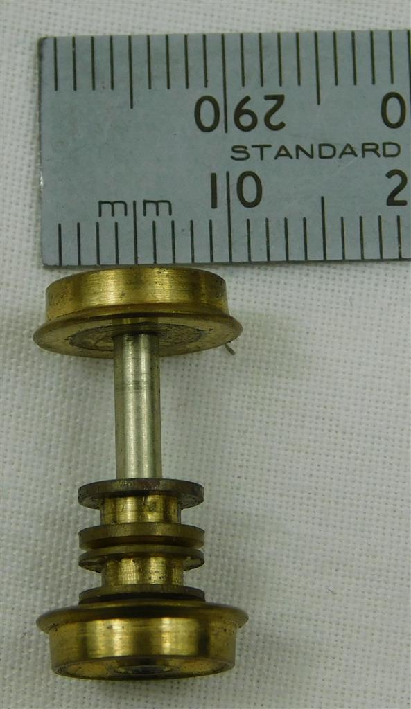 6 9.5mm inside bearing wheels with bearings, brass/one darkened, make unknown