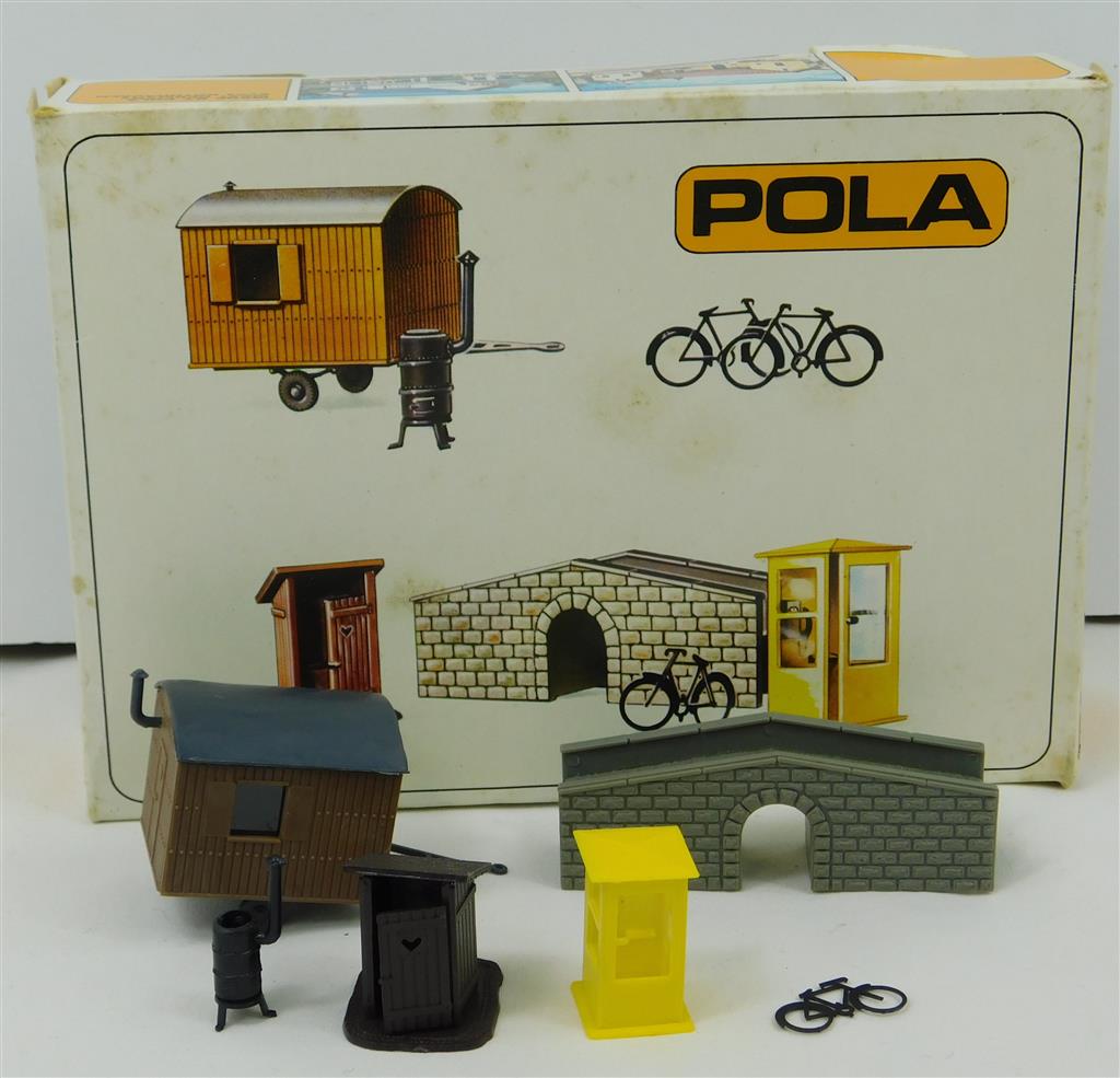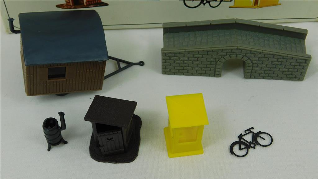 An assembled Pola 452 Small bridge, telephone kiosk, privy, cycle (one only) and workmans trailer, supplied in the original box