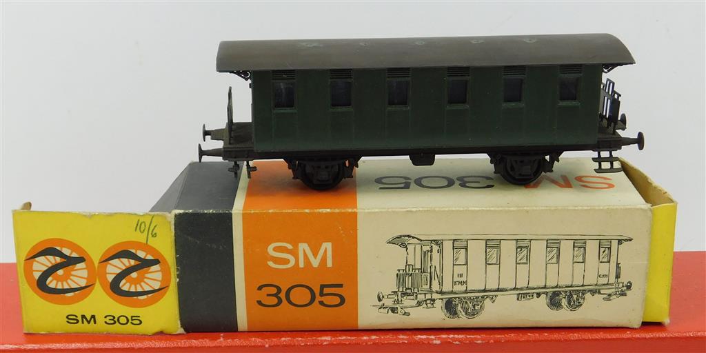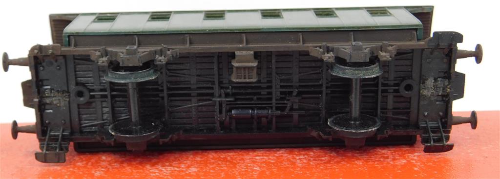 A Rivarossi SM305 Italian FS 4 wheel green coach missing coupings and some footsteps, in fair condition, supplied in the original box