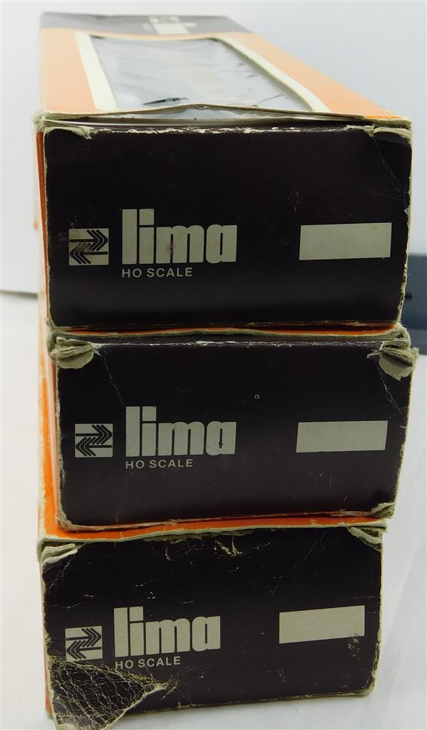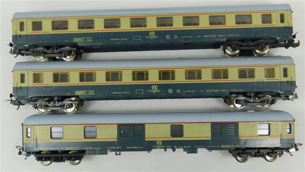 3 Lima Italian FS express coaches, in fair condition, missing some buffers, supplied in tatty original boxes