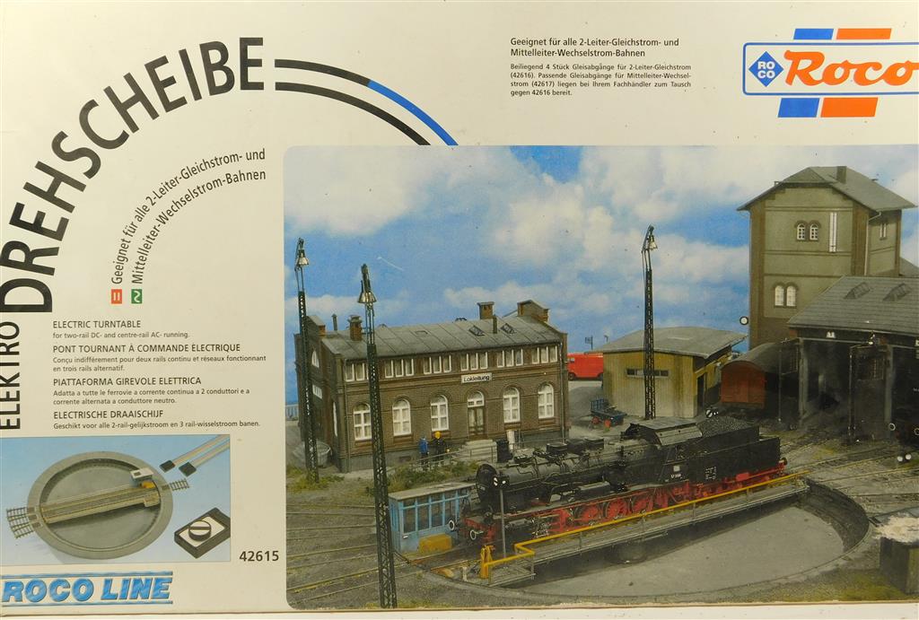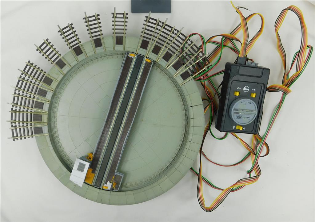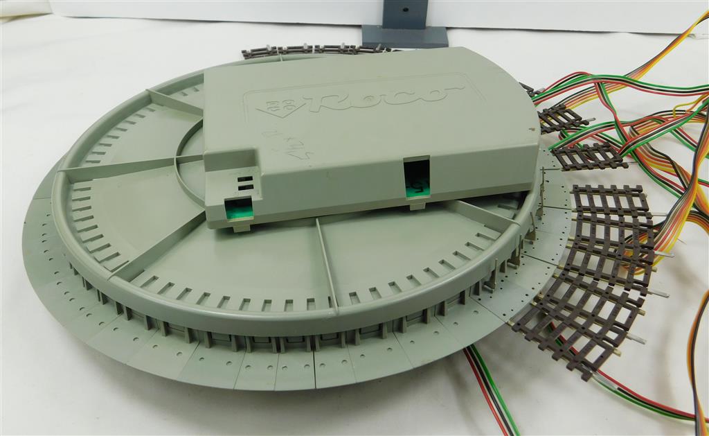 A complete Roco Line operating turntable, in working order, as removed from a layout, supplied in the tatty original box, with an assortment of extra connectors and instructions, note this is code 83 (2.1mm) high rail and will not connect to Peco or Hornby track. Ensure the DC/AC switch on the back of the control unit is set to DC otherwise it will not work properly