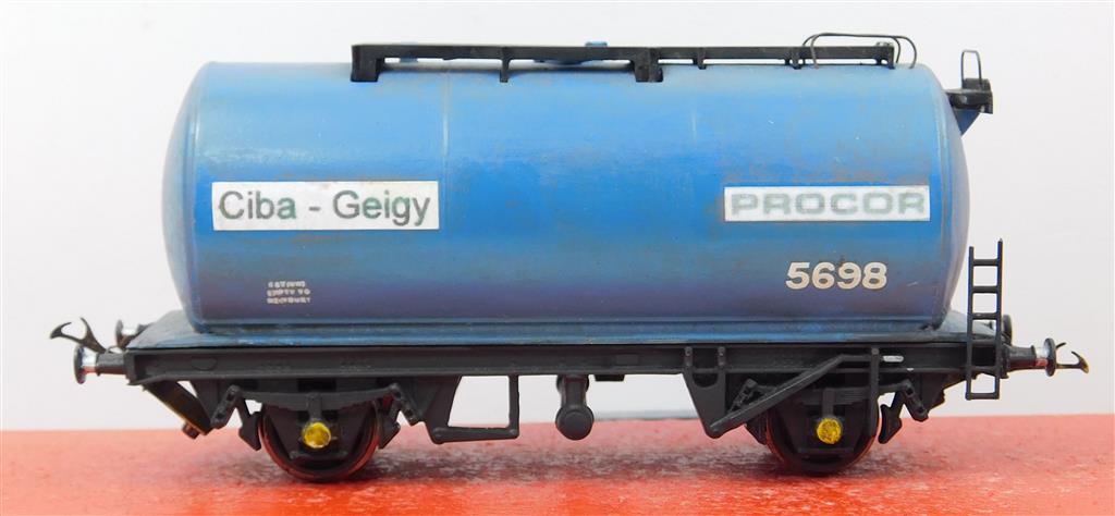 EM and P4 Gauge: Hornby repainted CIBA-GEIGY monobloc tank wagon with EM gauge and Spratt & Winkle couplings
