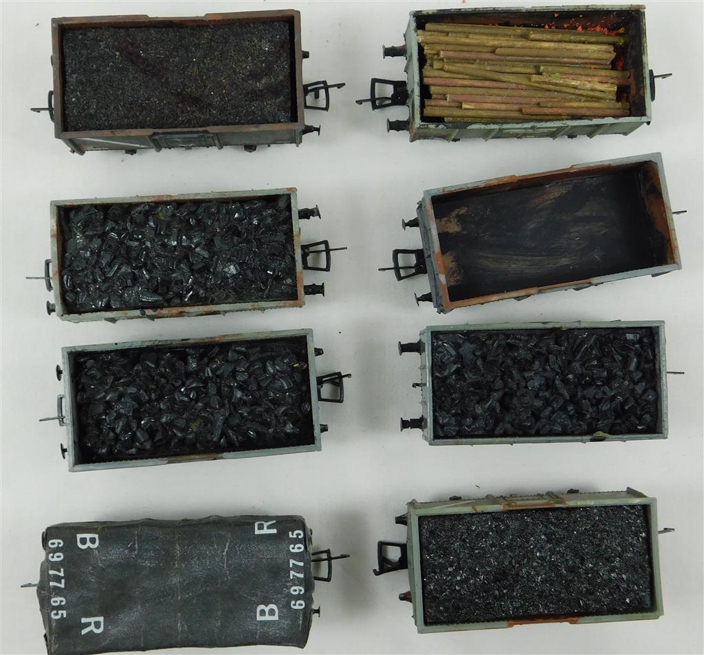 8 different kitbuilt BR 16T mineral wagons, some missing buffers or tiebars, some with loads, small repairs needed, a project!