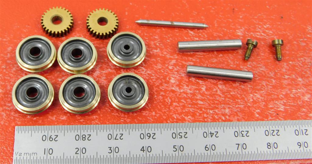 Set Ultrascale 12mm diameter replacement wheels, axles and gears for a Tri-ang motor bogie, with one additional wheelset, no original box, will need a press to set the gauge correctly