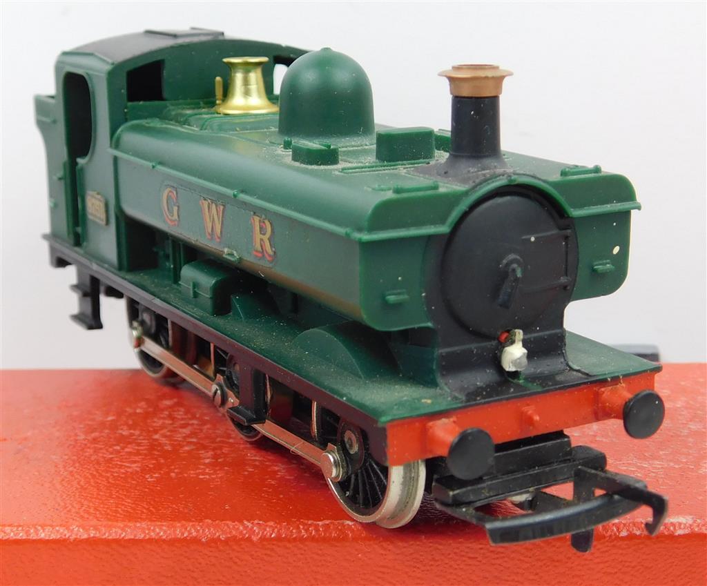 A Hornby 1970s production pannier tank, erratic runner with added headlight that flickers, needs a thorough electrical clean and lubrication, no original box. Please note this chassis needs a controller capable of delivering at least 600mA to run well, and doesn't like new Hornby or Peco points as it has deep flanged wheels.