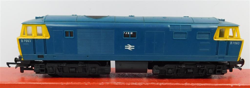 A Tri-ang Hornby blue Hymek, noisy runner, needs a thorough electrical clean and lubrication, no original box. Please note this chassis needs a controller capable of delivering at least 600mA to run well, and doesn't like new Hornby or Peco points as it has deep flanged wheels.