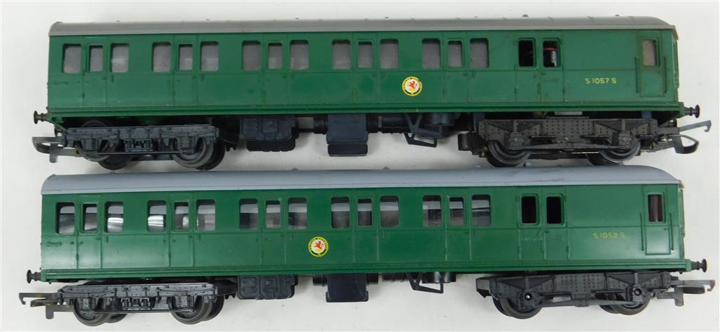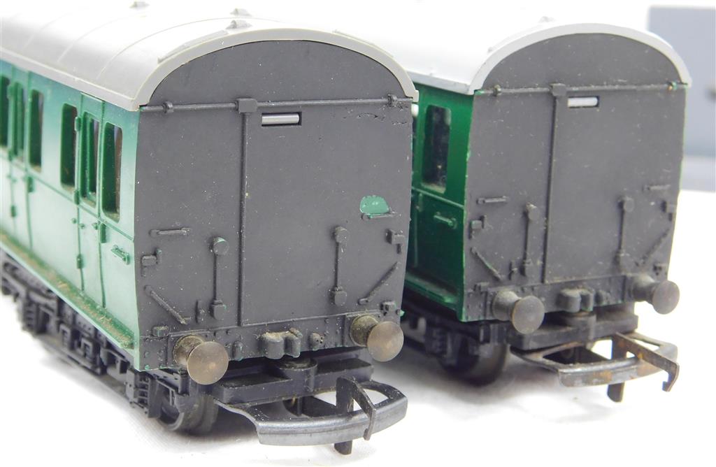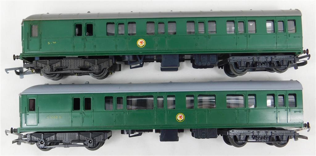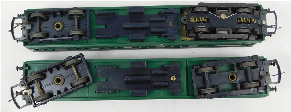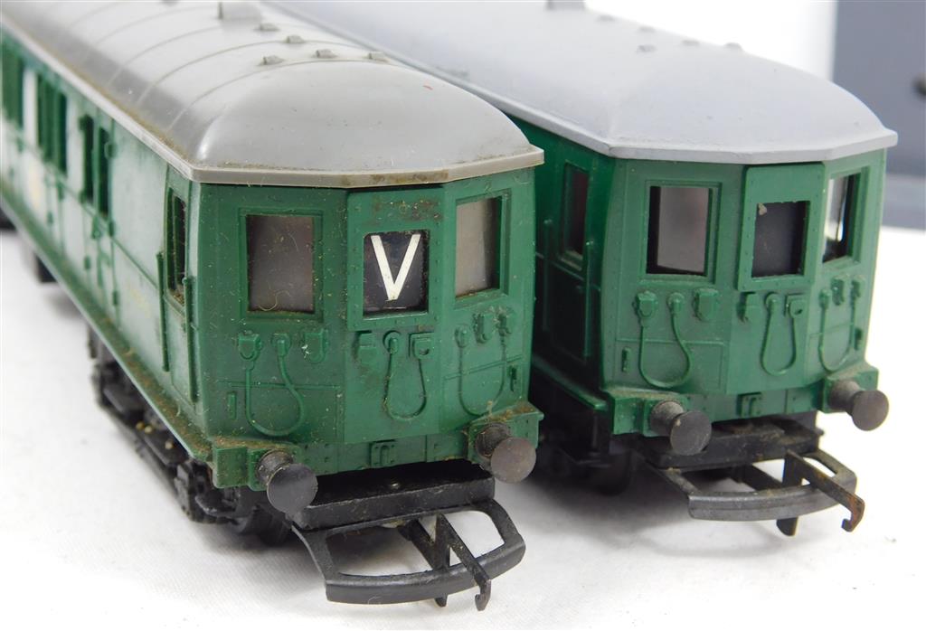A Tri-ang 2 car EMU, noisy erratic runner, needs a thorough electrical clean and lubrication, later production version with pin-point axles on the inner bogies, no original box. Please note this chassis needs a controller capable of delivering at least 600mA to run well, and doesn't like new Hornby or Peco points as it has deep flanged wheels.