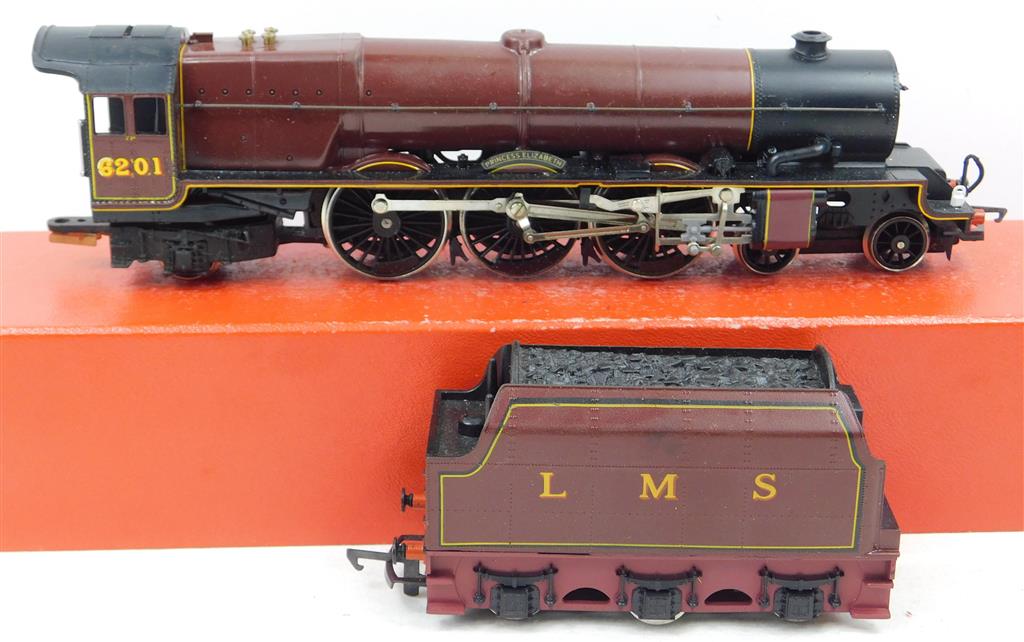 A Hornby tender drive LMS Princess Elizabeth with Duchess tender, reluctant runner, needs a thorough electrical clean and lubrication, needs a clean, some repainting, missing buffer, in fair condition, no original box