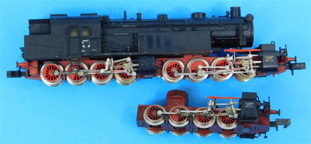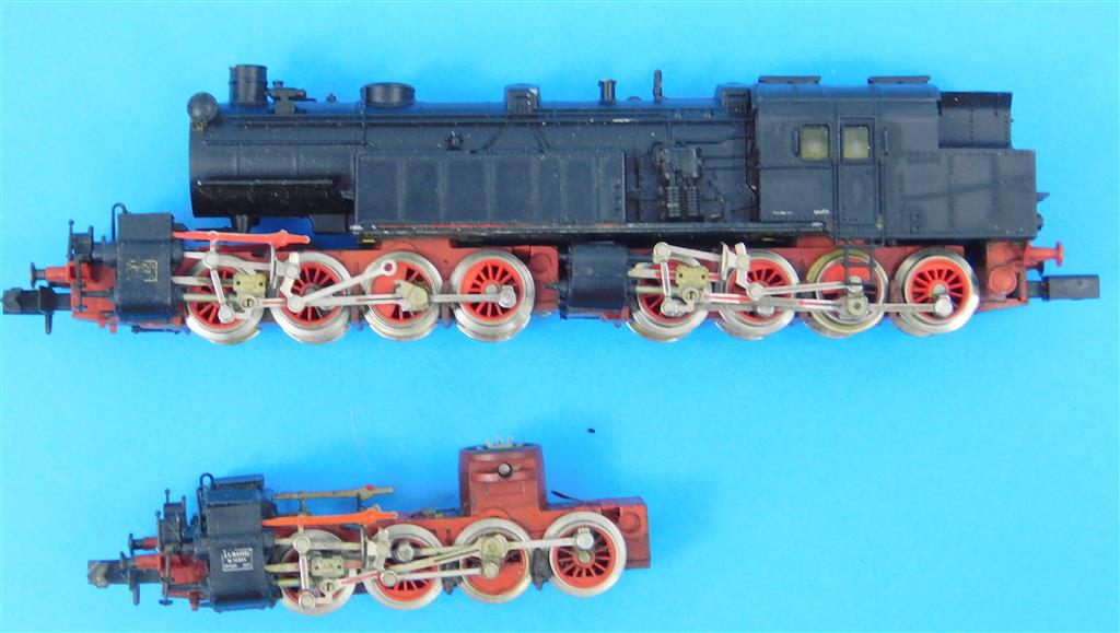 An Arnold N gauge Bavarian Mallet 0-8-8-0T, reluctant runner, needs a thorough electrical clean and lubrication, needs a clean, detached valve gear one side, supplied with a spare front drive unit that could be swapped with the existing one to solve the valve gear issue, in fair condition, no original box