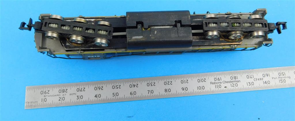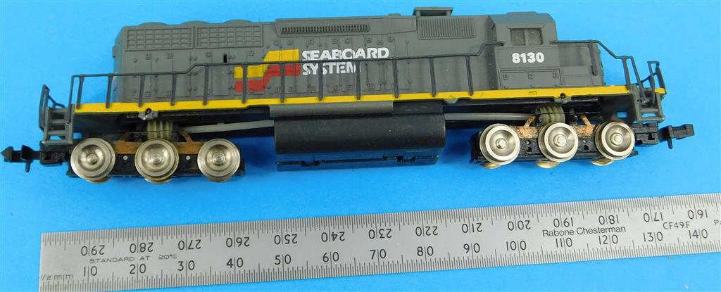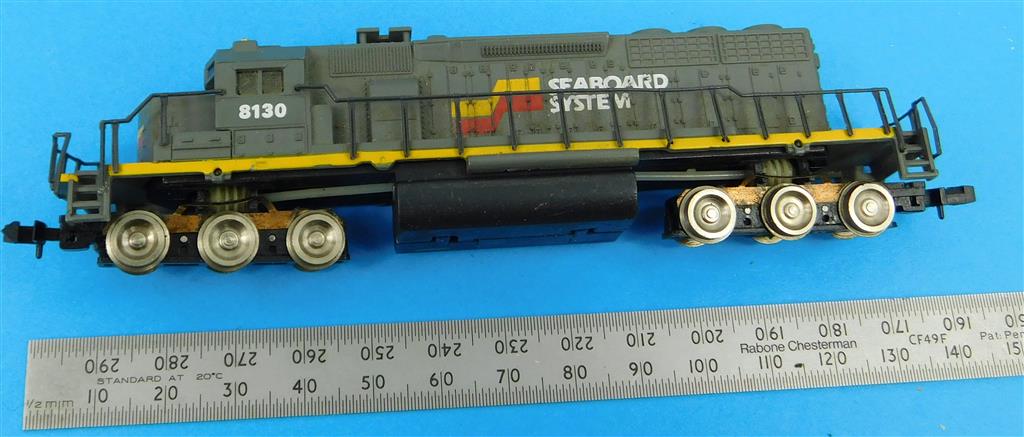 An N gauge Seaboard diesel loco, slow runner so needs a thorough electrical clean and lubrication, missing bogie sideframes, make unknown, in poor condition, no original box, sold as a project or a source of parts