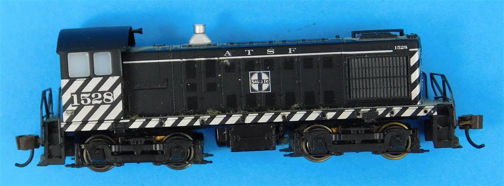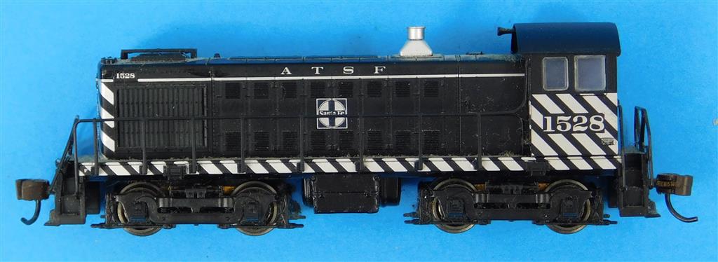 An N gauge ATSF diesel loco 1528, DCC fitted (Bachmann chip) #3, slow runner on both DC and DCC but would benefit from an electrical clean, with non-directional headlight, missing handrail one side, needs a thorough clean, in fair condition, no original box