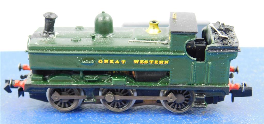 A nicely painted GWR Half Cab Pannier Tank kit built body on Graham Farish N gauge chassis, good runner, wonky chimney needs adjustment, sold as a cosmetic project