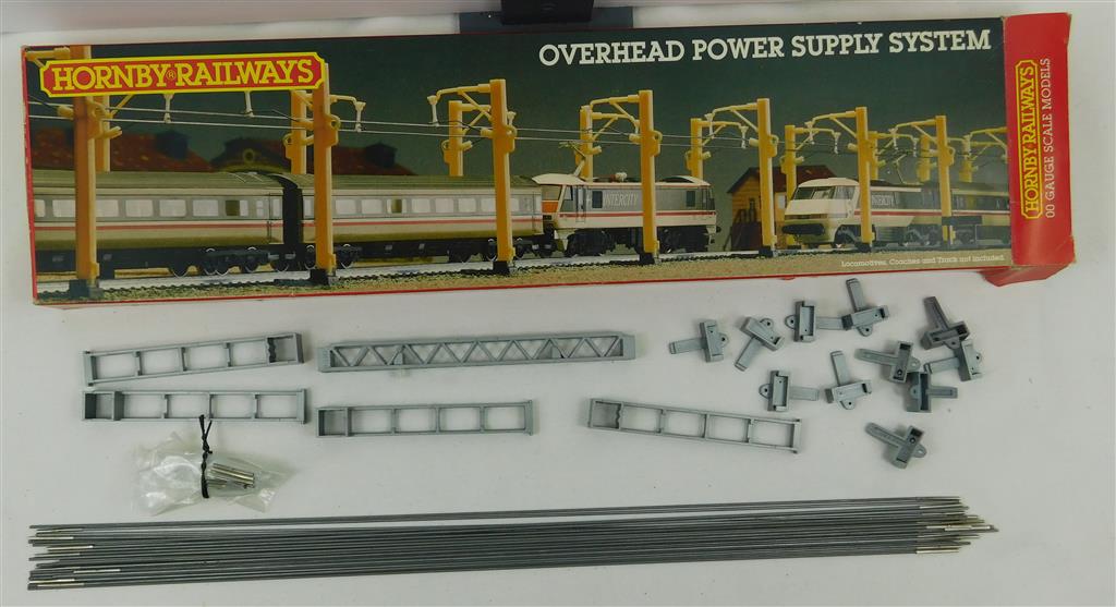 Some Hornby catenary wires with parts for a double track gantry (missing one dropper) and some bases, in good condition, supplied in an original packet