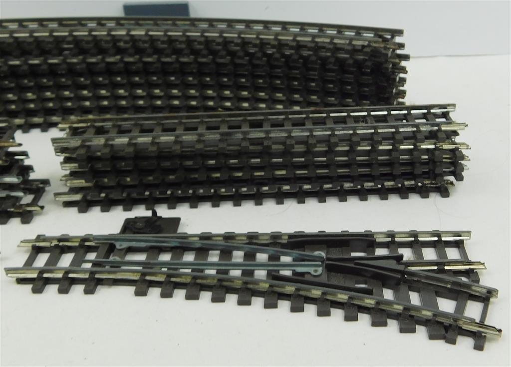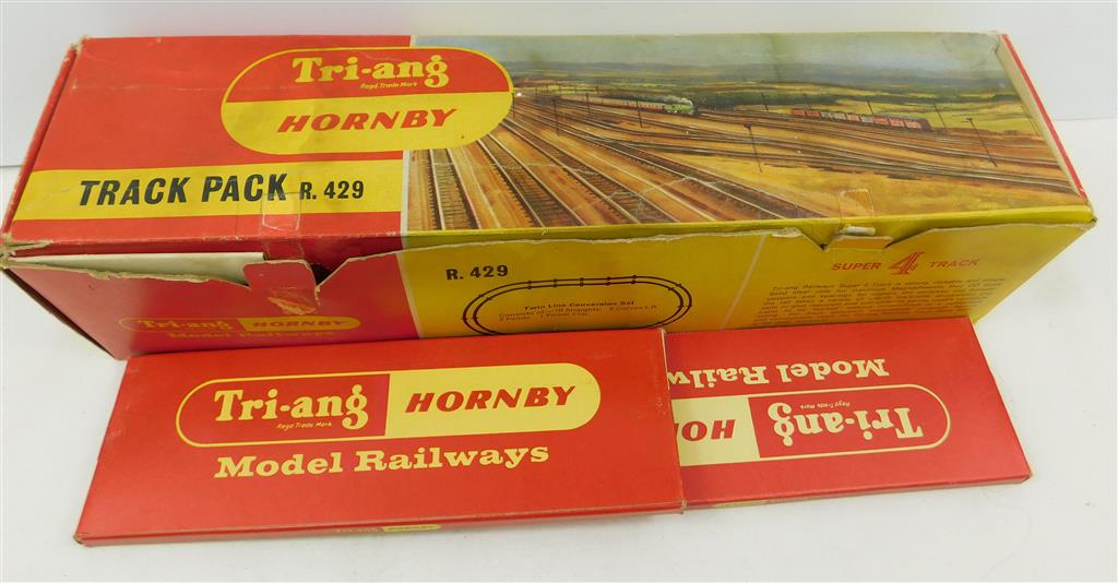 A Tri-ang R429 Super 4 Track Pack: 8 second radius curves, 10 straights, 2 right hand points, no power clip, in good used condition but needs a clean, supplied in a tatty original box