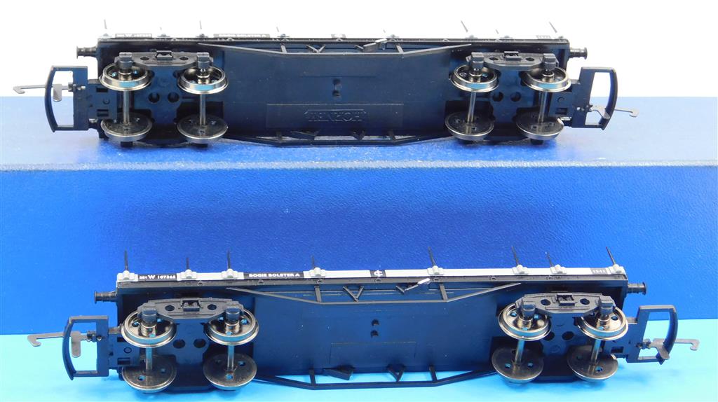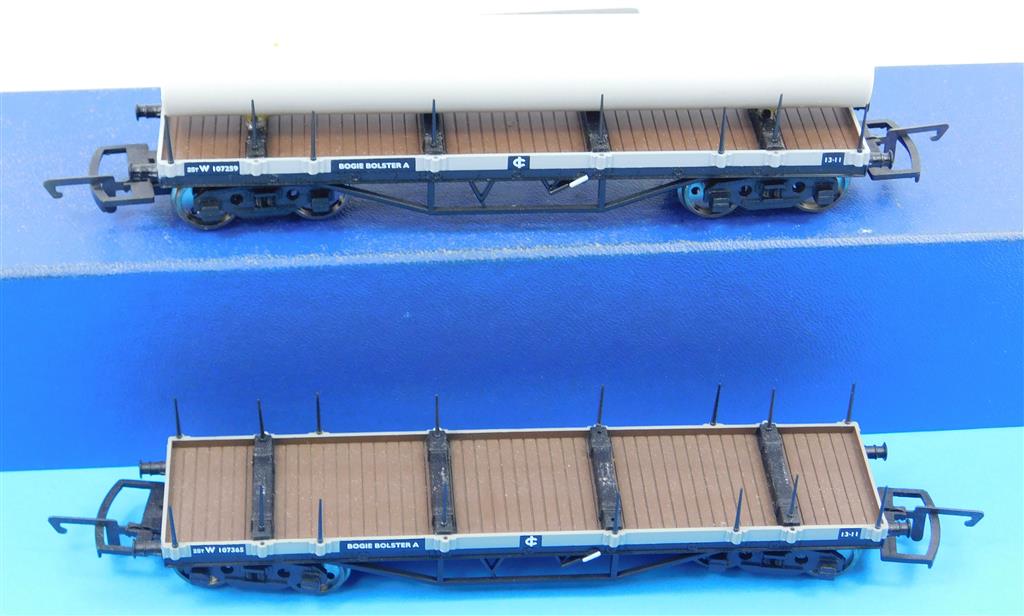 2 Hornby BR bolster A wagons number W107259 and W107365, in good condition, with added loose pipe, no original box