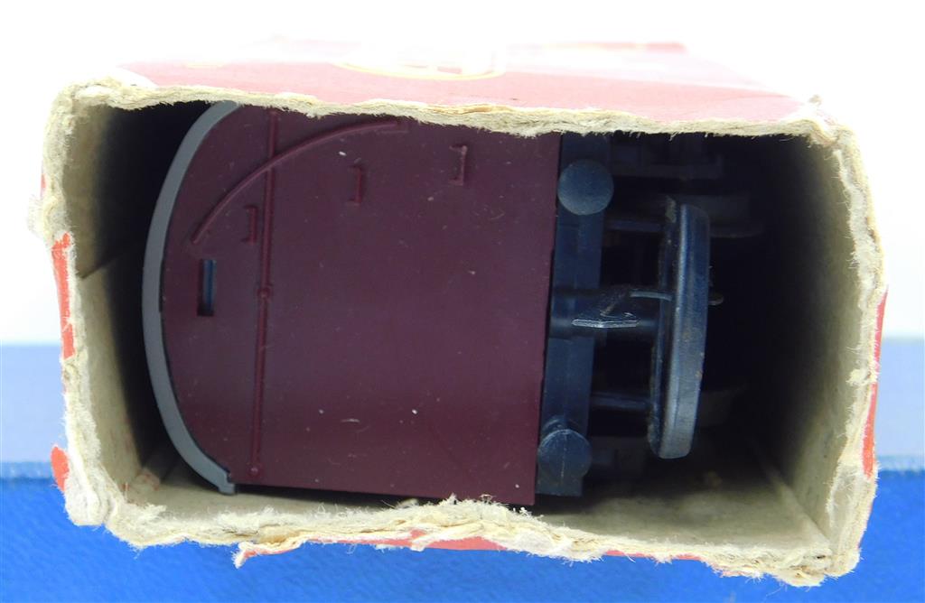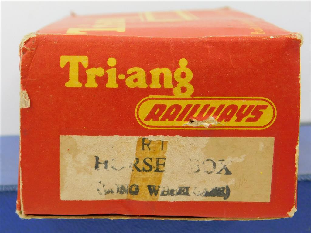 A Tri-ang R123 Horse Box with MkIII couplings and plastic chassis with pin point axles, rusty couplings otherwise in good condition, needs a clean, tatty original box