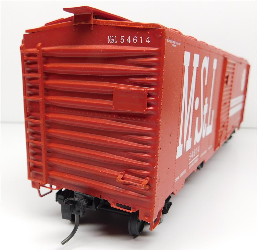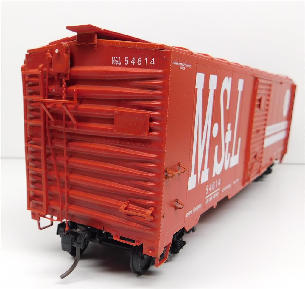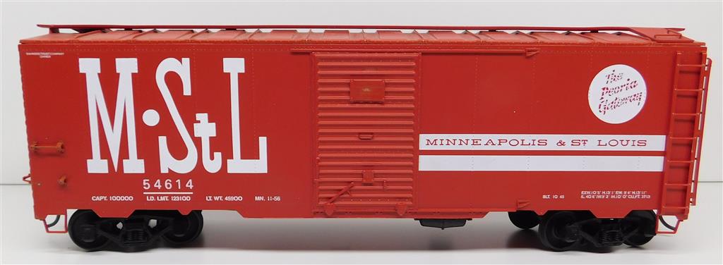 An American 0 scale M St L box car with Kadee couplings 54614, plastic bodied, fine scale wheels, missing handrails otherwise in good condition, no original packaging